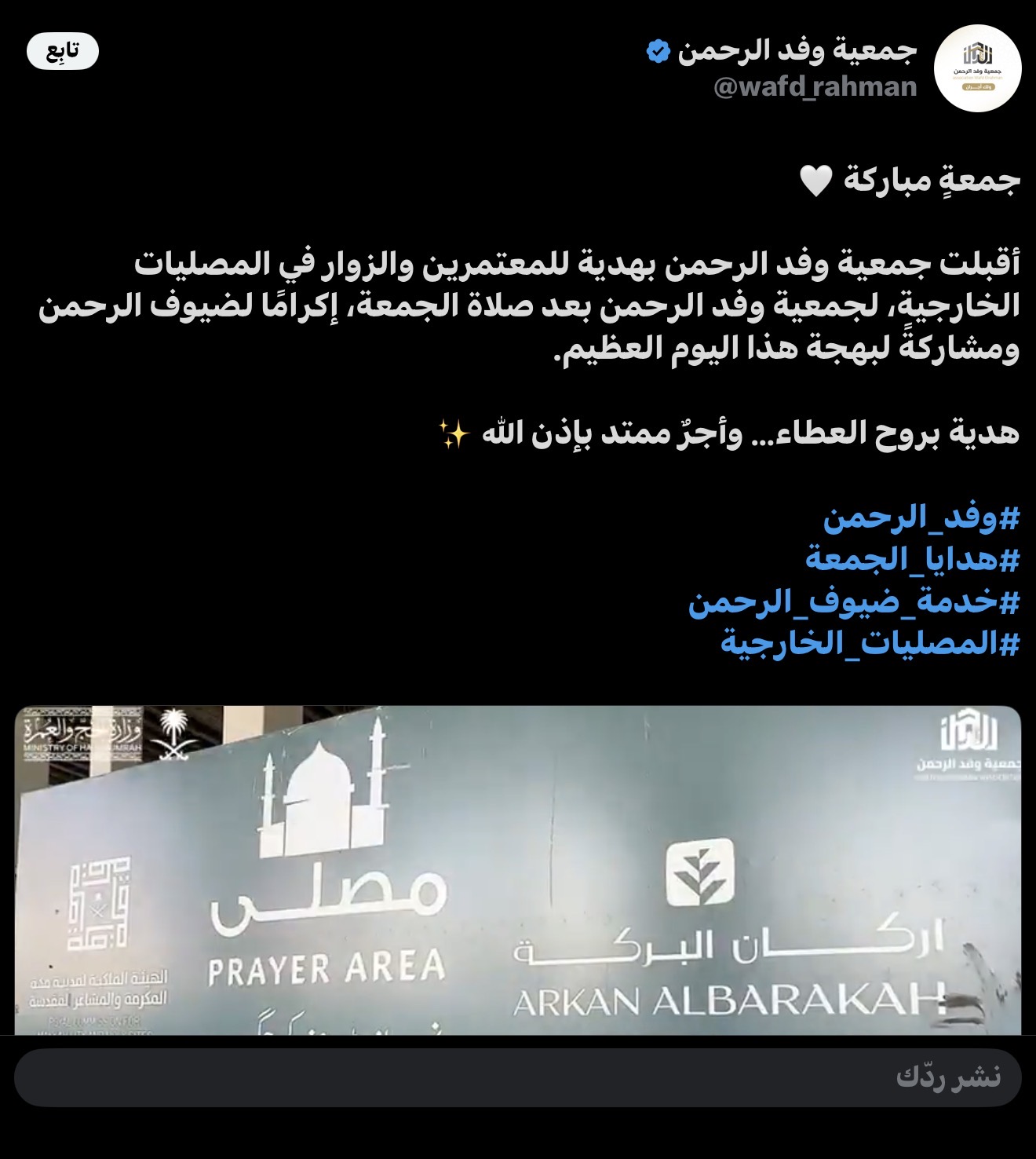 أقبلت جمعية وفد الرحمن بهدية للمعتمرين والزوار في المصليات الخارجية، لجمعية وفد الرحمن بعد صلاة الجمعة، إكرامًا لضيوف الرحمن ومشاركةً لبهجة هذا اليوم العظيم.