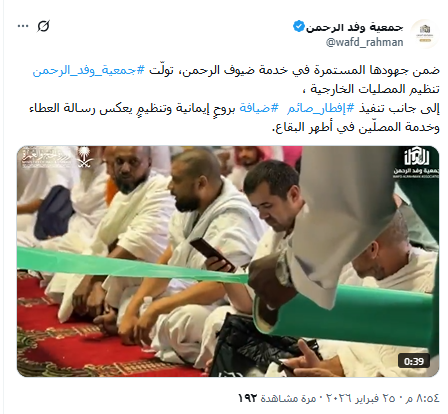 ضمن جهودها المستمرة في خدمة ضيوف الرحمن، تولّت جمعية وفد الرحمن تنظيم المصليات الخارجية